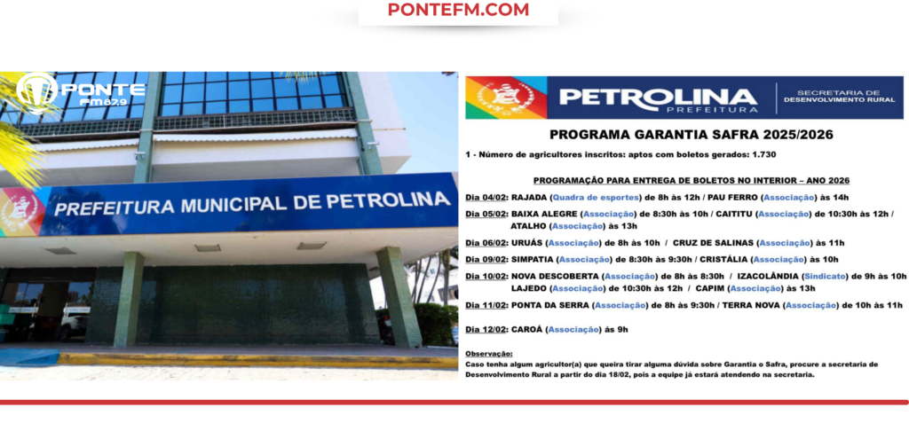 A Prefeitura de Petrolina, por meio da Secretaria de Desenvolvimento Rural, inicia neste mês de fevereiro a entrega dos boletos do Programa Garantia-Safra 2025/2026 para agricultores familiares do município. Ao todo, 1.730 agricultores estão aptos, com boletos já gerados, garantindo mais um passo importante no fortalecimento da agricultura familiar e na segurança de renda para […]