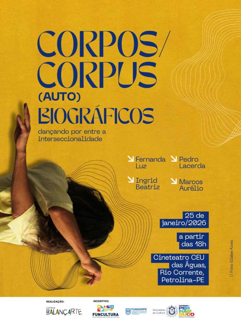 Corpos que guardam memórias, histórias que se revelam no gesto e movimentos que dizem aquilo que muitas vezes não encontra palavra. É a partir dessa escuta sensível do corpo que nasce a mostra “Corpos/Corpus (Auto)biográficos, dançando por entre a interseccionalidade”, que acontece no dia 25 de janeiro, próximo domingo, a partir das 18h, no Cineteatro CEU das Águas, no […]